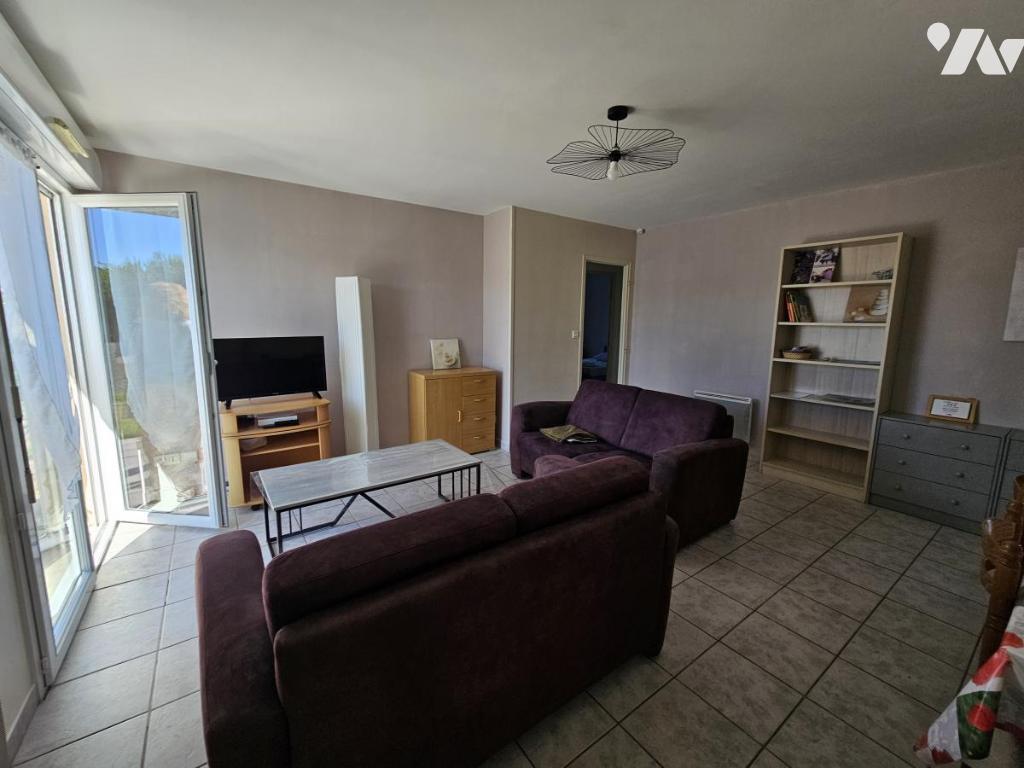 Une entrée donnant sur un séjour/salon lumineux, avec accès à une terrasse d'environ 15 m²